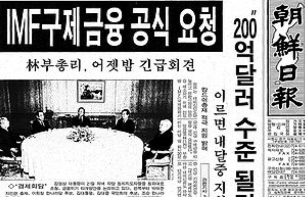 - 1997년, 대한민국이 외환 부족으로 국제통화기금(IMF)에 구제금융을 요청하게 된 경제 위기 상황을 말합니다.