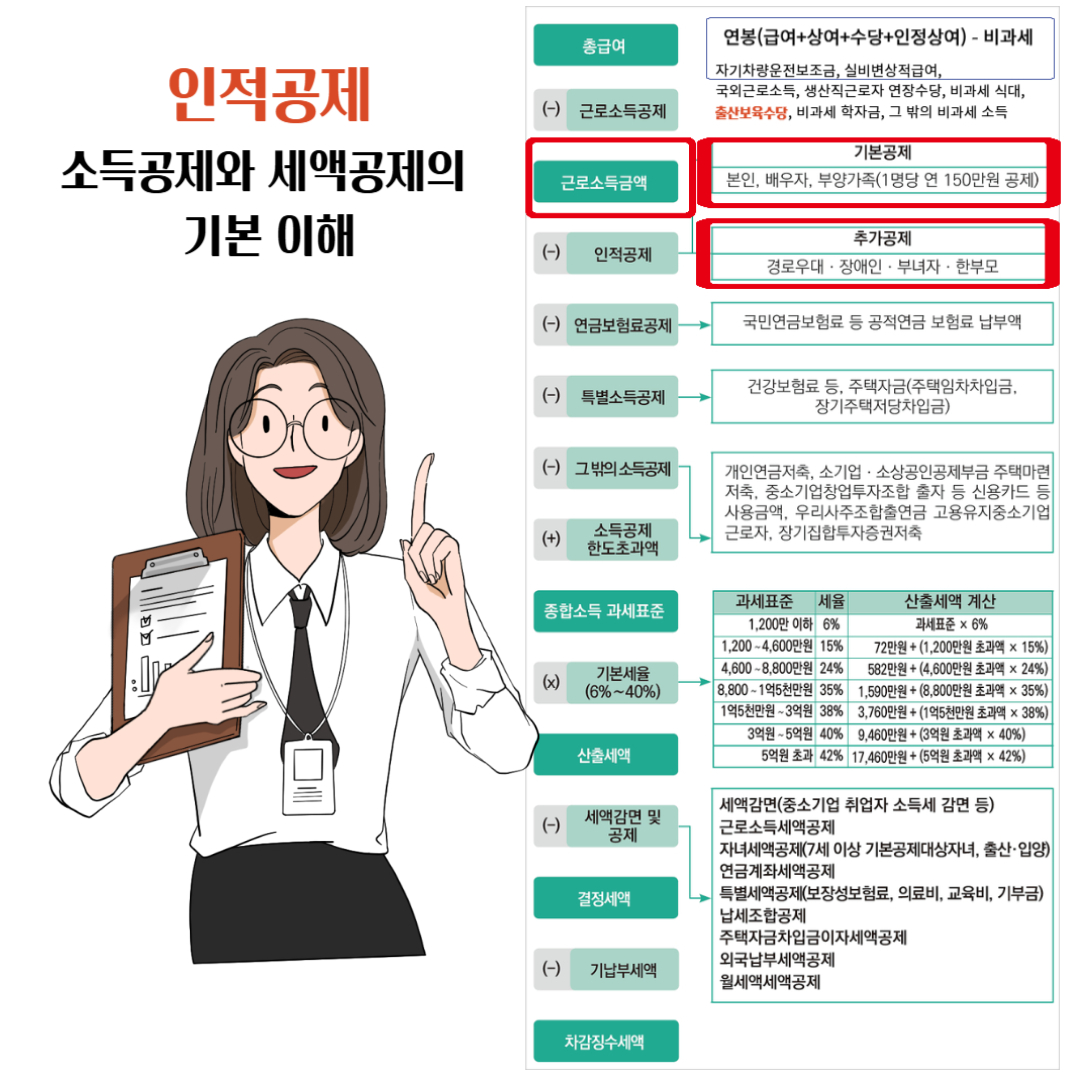 인적공제는 소득공제에서 중요한 항목으로, 가족 구성원과 개인 상황에 따라 공제 혜택이 달라질 수 있습니다. 공제 대상과 조건을 잘 확인하여 최대한의 혜택을 받으세요. 세부사항은 국세청 또는 세무 전문가와 상담해보는 것이 좋습니다.