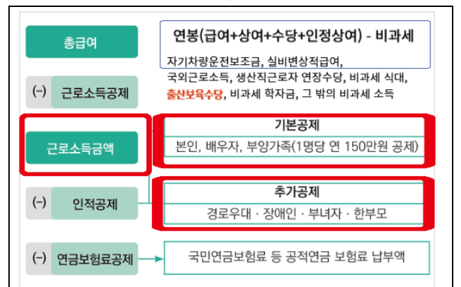 - 추가공제로 장애인 공제 200만 원, 경로우대 공제 100만 원을 받을 수 있습니다.