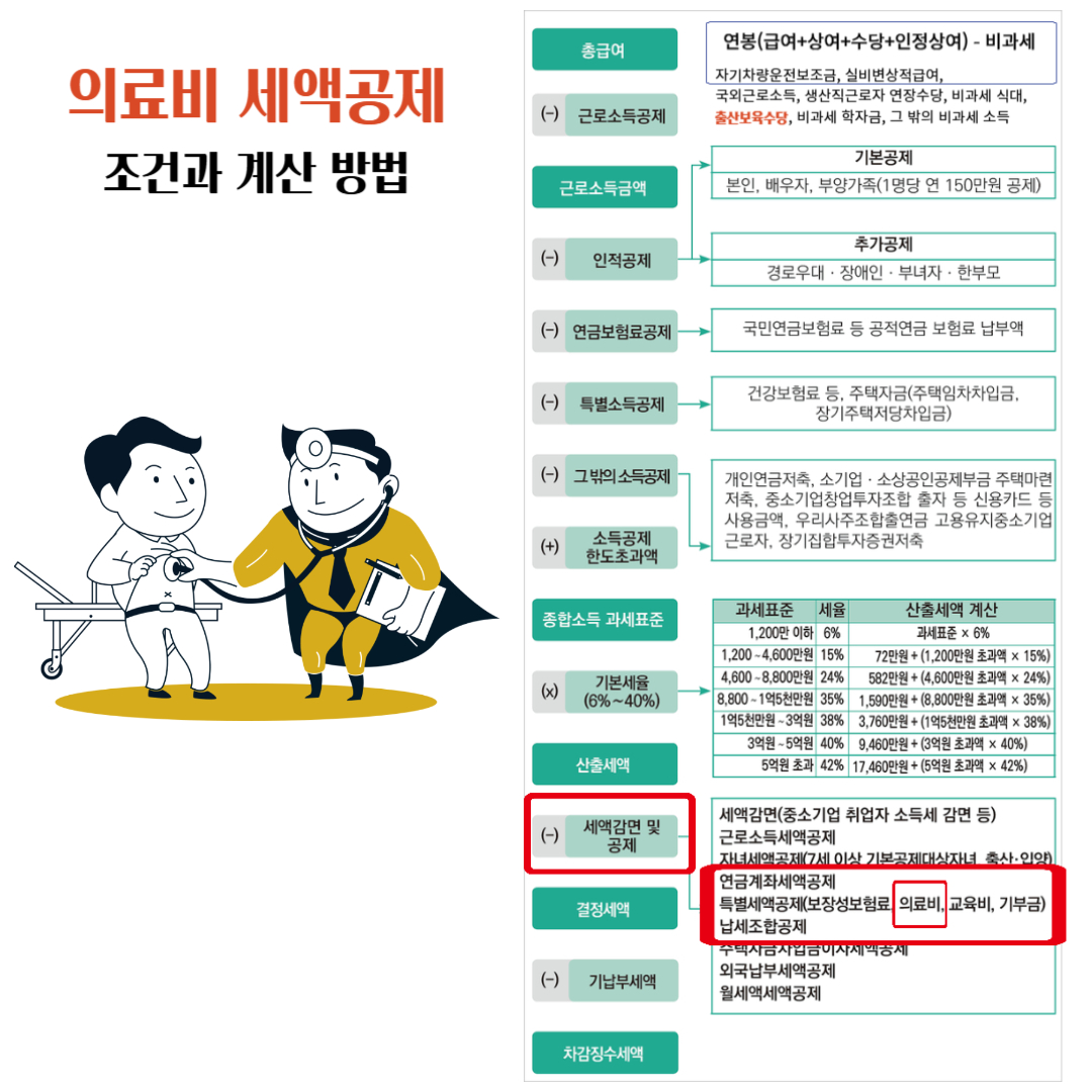 의료비 세액공제는 총 의료비 중 일정 금액을 초과하는 지출에 대해 적용됩니다. 구체적인 계산 공식은 다음과 같습니다.