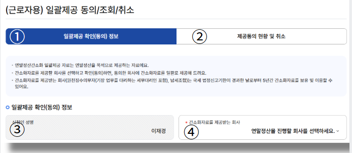 ♠ 홈택스 → 장려금 · 연말정산 · 전자기부금 → 연말정산 간소화 → 연말정산 일괄 제공 → (근로자용) 일괄 제공 동의/조회/취소