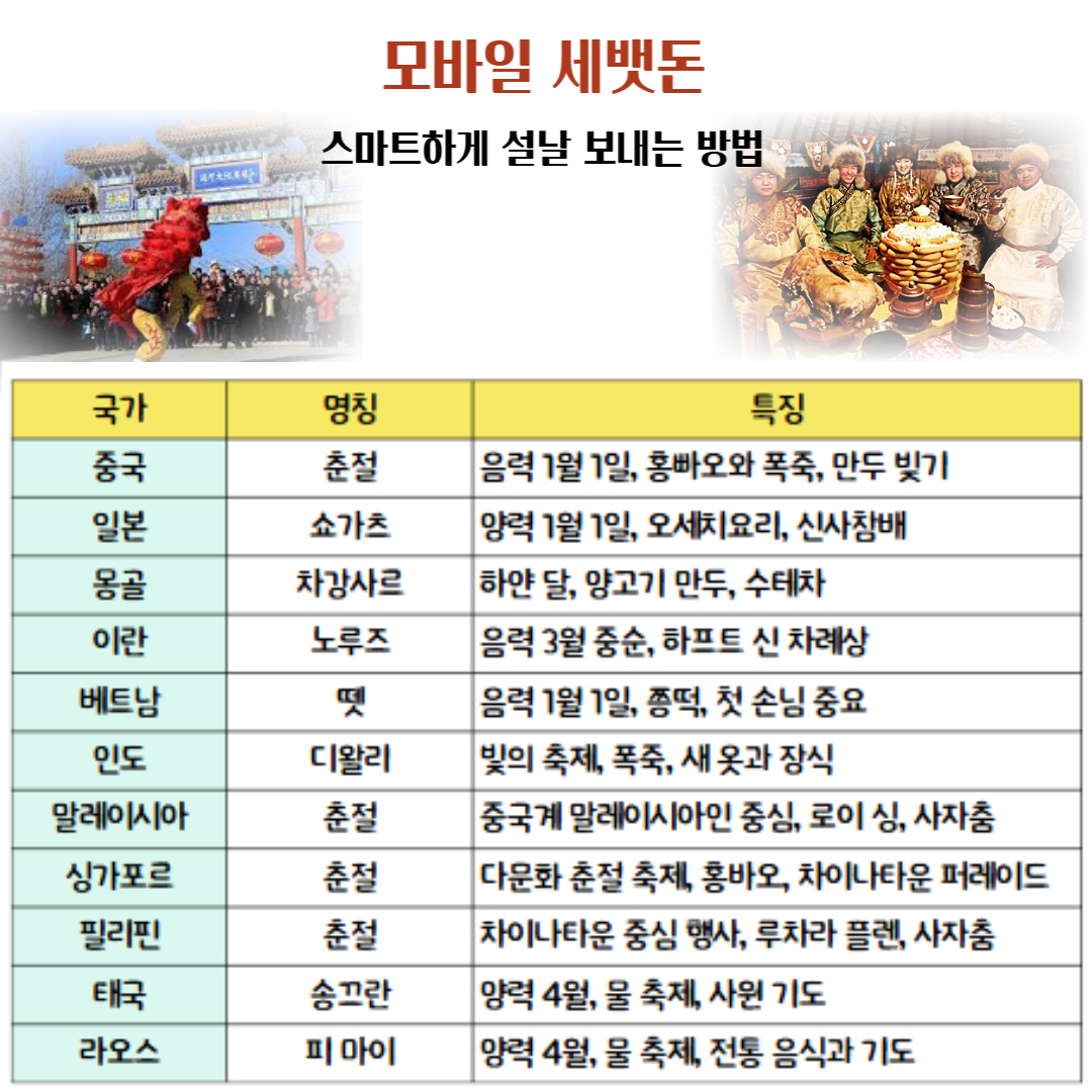 음력 1월 1일, 민족 최대의 명절 설날은 가족과 함께하는 기쁨의 날입니다. 우리나라뿐 아니라 다른 나라들도 새해를 맞아 특별한 풍습과 문화를 이어가고 있는데요, 이번 글에서는 세계 각국의 설날 풍습을 함께 알아보겠습니다.