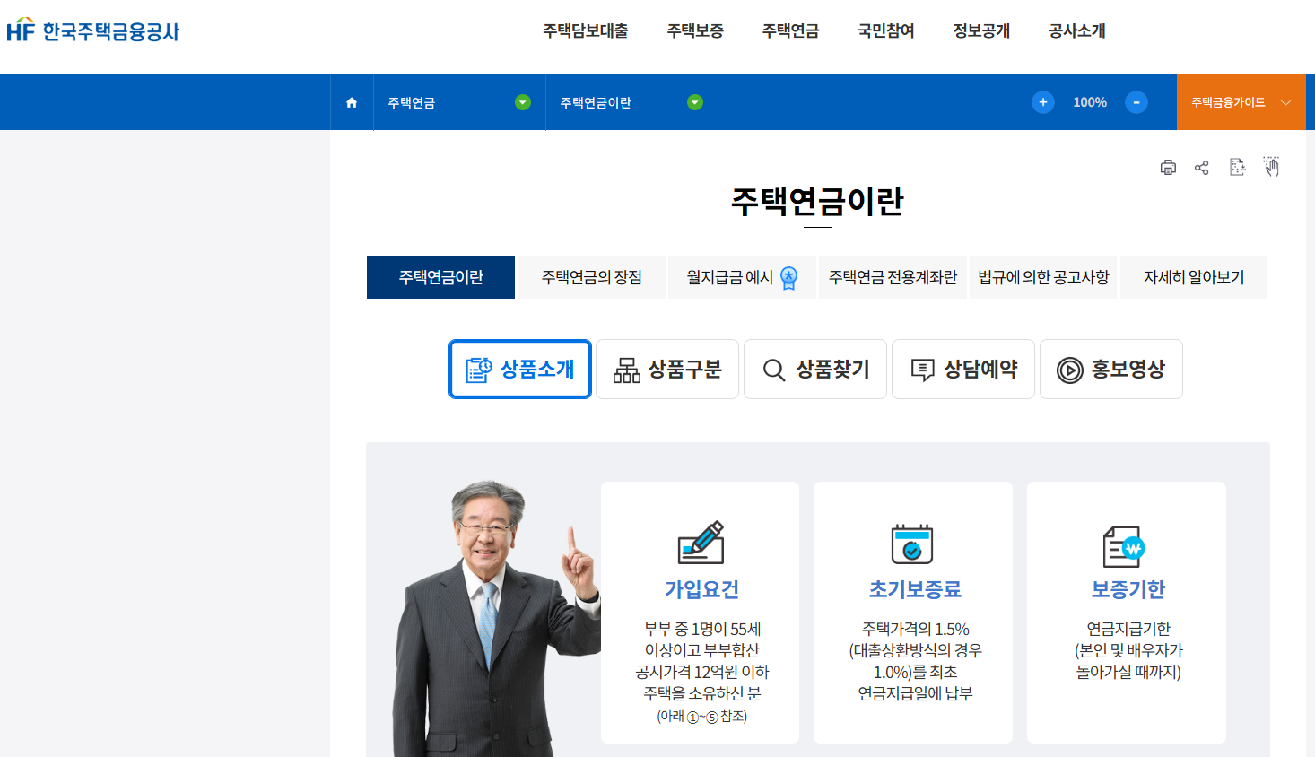 - 가입대상: 55세 이상, 주택 공시가격 9억 원 이하 소유자.