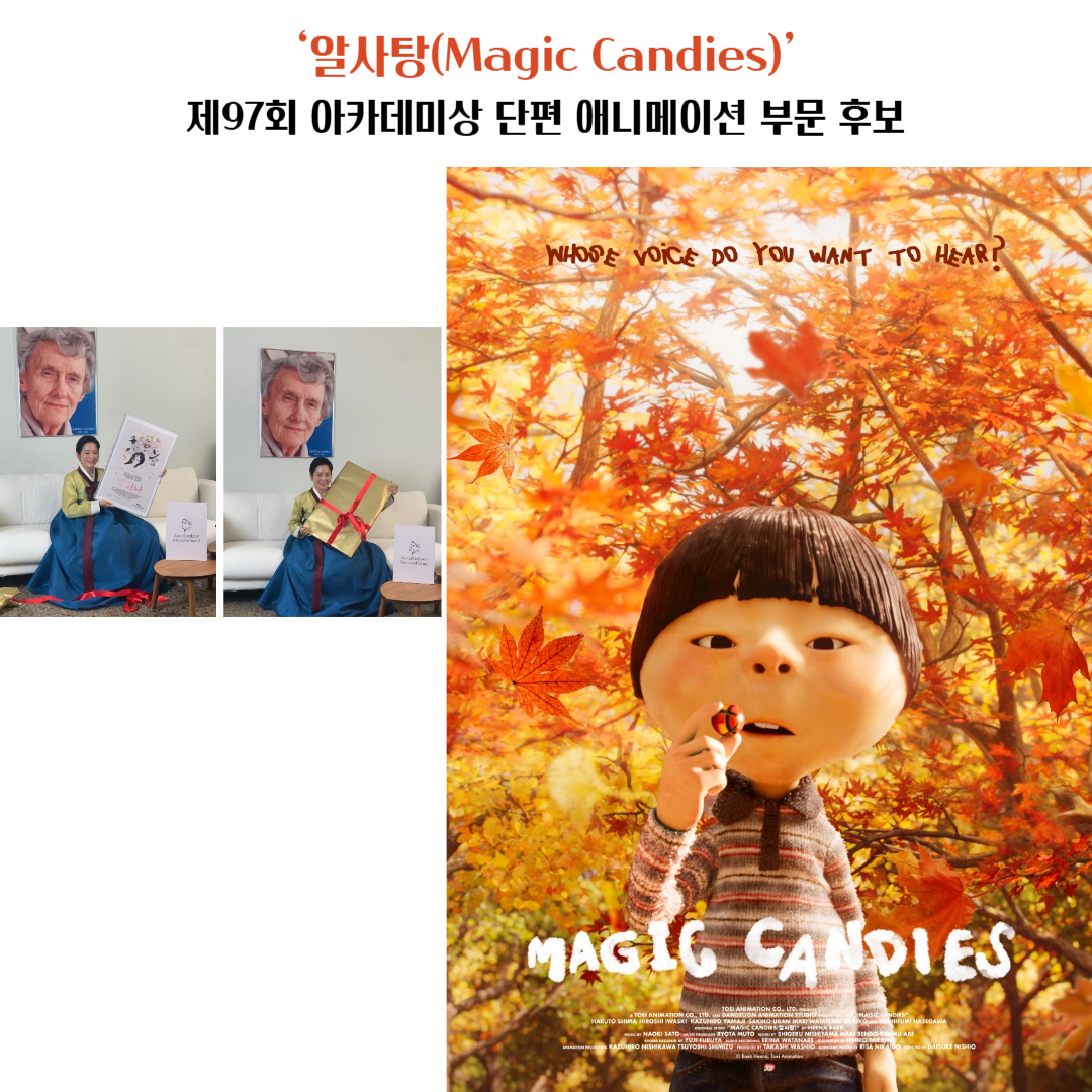 - 백희나 작가의 그림책 '알사탕'을 원작으로 한 단편 애니메이션 '알사탕(Magic Candies)'은 일본의 토에이 애니메이션에서 제작하였습니다. 이 작품은 소통에 서툰 아이 '동동이'가 신비한 알사탕을 통해 타인의 마음을 이해하고 자신의 마음을 전하게 되는 과정을 그린 21분짜리 3D 애니메이션입니다. 애니메이션 '알사탕'은 제97회 아카데미 시상식 단편 애니메이션 부문 후보에 올랐으며, 최종 수상작은 3월 11일 발표될 예정입니다.