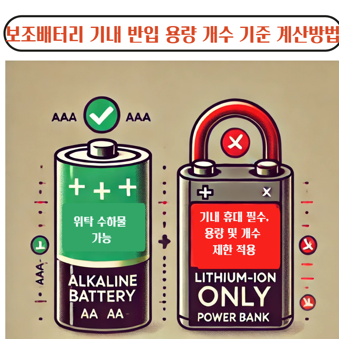 기본적으로 AA, AAA 같은 알카라인 건전지는 위탁 수하물로 보낼 수 있습니다. 하지만 리튬이온 배터리로 구성된 보조배터리는 화재 위험으로 인해 반드시 기내 휴대해야 합니다. 단, 기내반입 시에도 용량 및 개수 제한이 있으므로 아래 내용을 참고하세요.