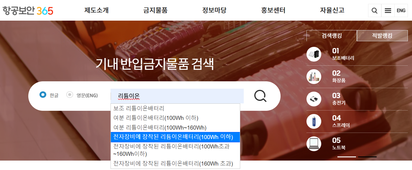 • 리튬이온 배터리: 기내 휴대 필수, 용량 및 개수 제한 적용