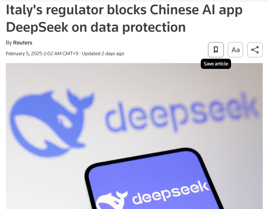 - 이탈리아: 앱 마켓에서 딥시크 서비스 제공 금지