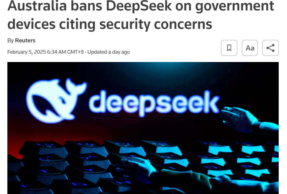 | 호주 | 정부가 보안 위험을 이유로 모든 정부 기기에서 딥시크 사용 금지. 내무부 장관이 국가 안보와 국익에 대한 "용납할 수 없는 위험"이라고 언급하며 즉각적인 금지 조치 발표. | Reuters |