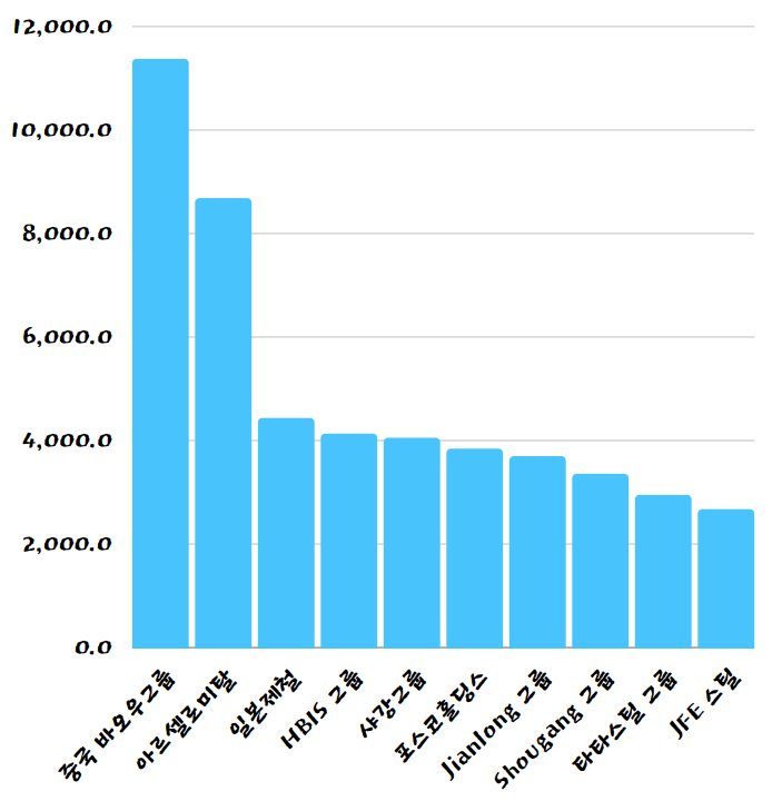 | 10 | JFE 스틸 | 일본 | 2,674.6 |