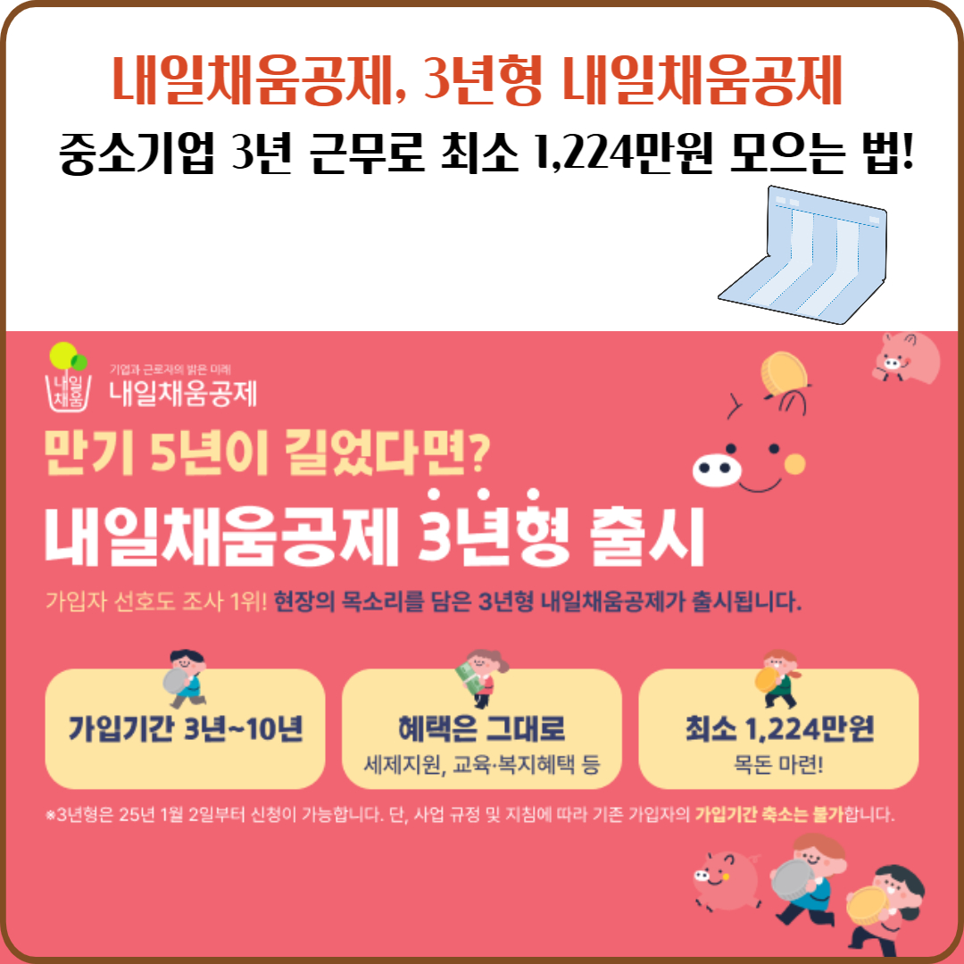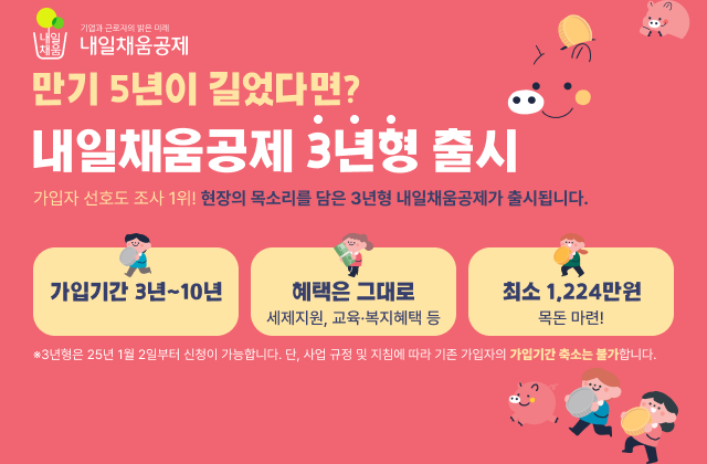 중소기업에서 근무하면서 목돈을 마련할 수 있는 좋은 제도가 있습니다. 바로 ‘3년형 내일채움공제’입니다. 기존 5년형에서 가입 기간을 3년으로 단축하여 근로자와 기업 모두 부담을 줄이면서도 높은 혜택을 받을 수 있는 공제 상품입니다.