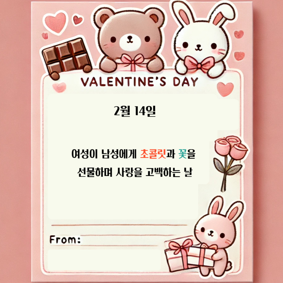 • 2월 14일(발렌타인데이) : 여성이 남성에게 초콜릿과 꽃을 선물하며 사랑을 고백하는 날