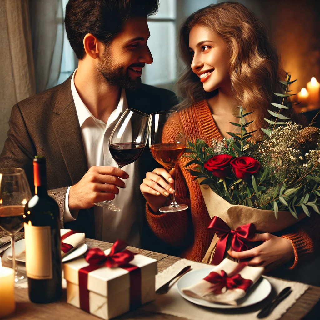 사랑하는 연인끼리 와인과 꽃다발을 선물하는 날
