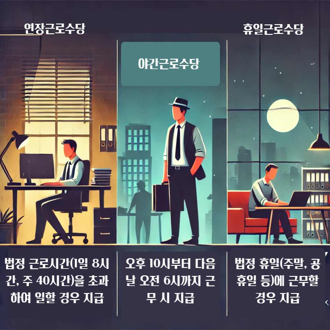 - 야간근로수당: 오후 10시부터 다음 날 오전 6시까지 근무 시 지급
