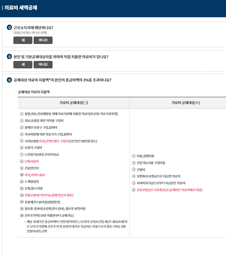 - 기존: 본인 또는 부양가족의 의료비에 대해 세액공제 적용.