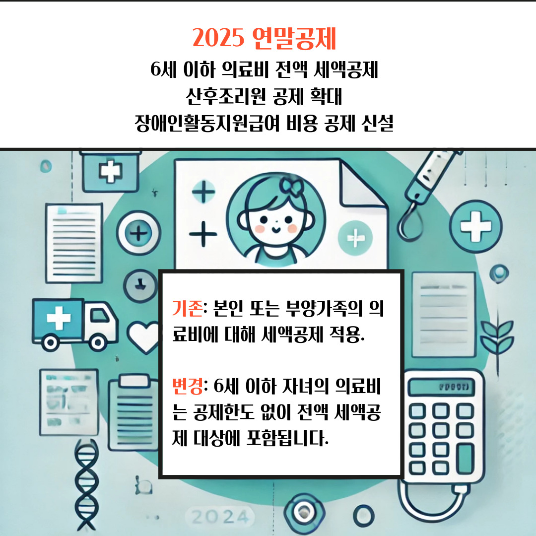 - 변경: 6세 이하 자녀의 의료비는 공제한도 없이 전액 세액공제 대상에 포함됩니다.