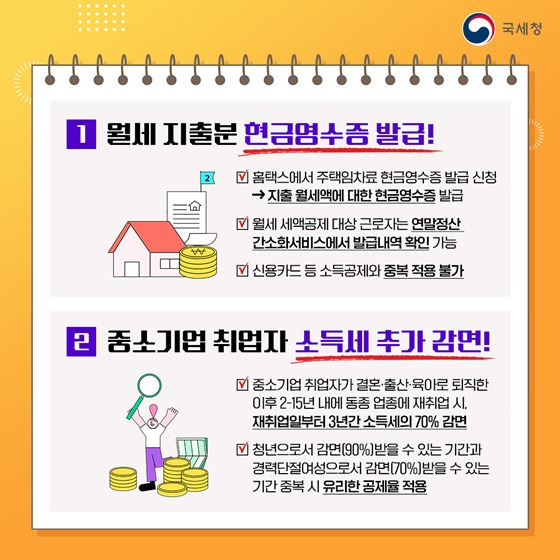 월세를 지출하고 계신가요? 홈택스를 통해 주택임차료에 대한 현금영수증을 발급받으면 세액공제를 받을 수 있습니다. 월세 세액공제 대상 근로자는 연말정산 간소화 서비스에서 발급내역을 확인할 수 있으니 반드시 챙기세요. 단, 신용카드 등 소득공제와 중복 적용은 불가능합니다.