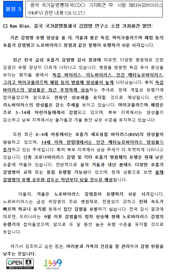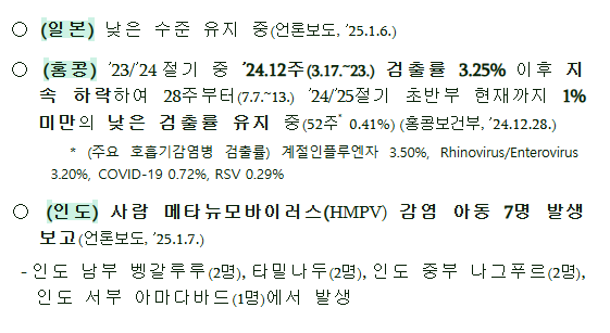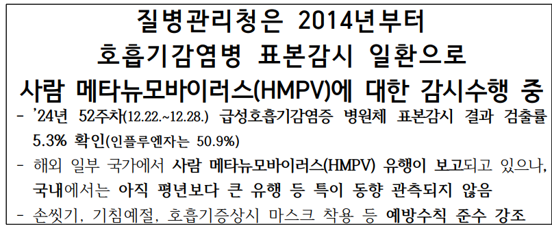 - 질병청 입장: "HMPV는 흔한 바이러스로, 현재 국내 유행은 평년 수준이다. 지나친 공포심을 가질 필요는 없다."