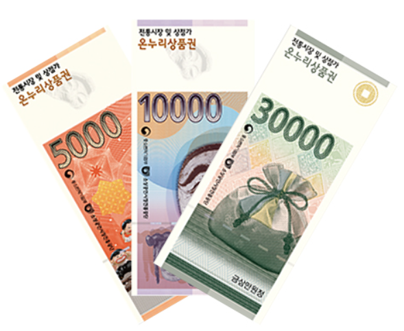 ※ 지류형은 종이 형태의 온누리상품권을 뜻합니다. 이는 실물 종이로 발급되어 전통시장이나 상점에서 현금처럼 사용할 수 있는 상품권입니다. 아래 이미지는 카드형, 모바일형, 지류형 상품권입니다.