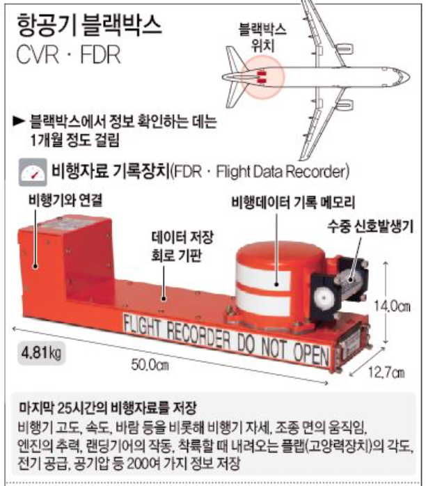 • FDR: 항공기의 운항 데이터를 약 25시간까지 기록.