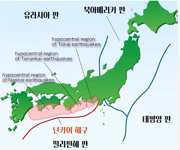 - 위치: 일본 혼슈 서남부의 시즈오카현에서 시코쿠 남부, 규슈 동부까지 이어지는 해구.