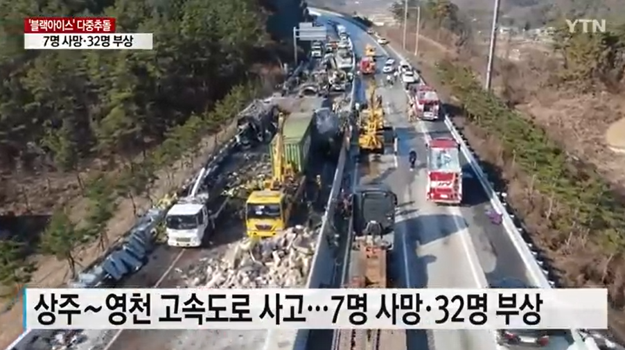 1) 상주∼영천 고속도로 43중 추돌 사고: 2019년 12월 14일, 경북 상주∼영천 고속도로에서 블랙아이스로 인해 43중 추돌 사고가 발생하여 7명이 사망하고 32명이 부상당했습니다.