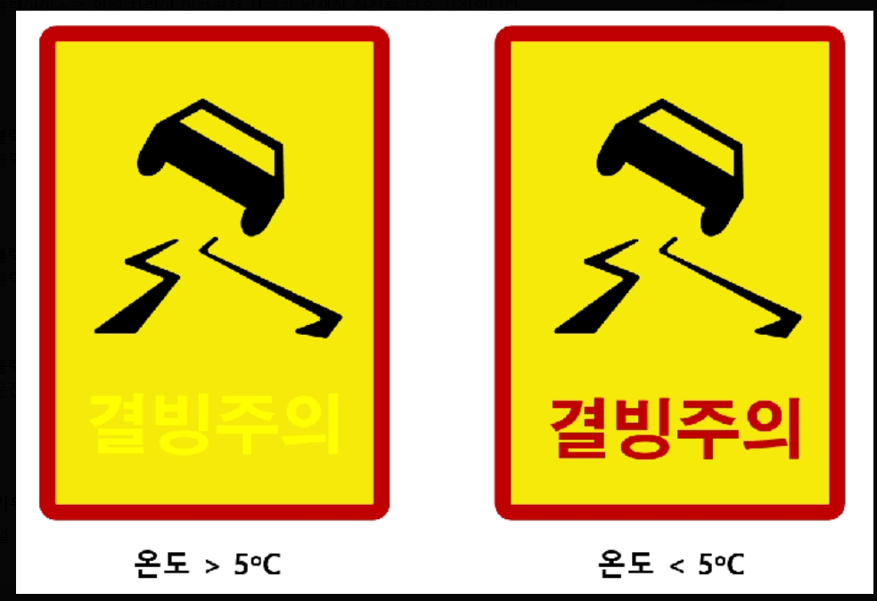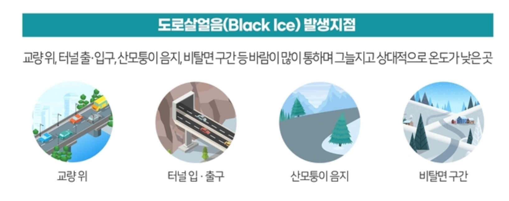 • 기온 급강하: 기온이 갑자기 떨어질 때 도로 표면의 수분이 얼어붙음.