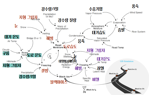 위 이미지는 블랙 아이스 형성을 예측하기 위한 시스템 다이내믹스 모델의 인과 루프를 보여줍니다. 이 모델은 공기 온도, 강수량, 구름 상태, 지형 그림자, 증발, 응축 등 여러 요인이 도로 온도와 도로 습도에 영향을 미쳐 블랙 아이스를 형성하는 과정을 설명합니다. "+"는 비례, "−"는 반비례 관계를 나타내며, 도로 온도와 습도가 블랙 아이스 형성의 핵심 변수로 작용합니다. GIS 시뮬레이션을 통해 시간별 블랙 아이스 발생량과 위치를 공간적으로 예측하며, 이는 교통사고 예방에 활용될 수 있다고 합니다. 각 색은 블랙아이스에 이르는 경로를 보여 주며, 각 단어에 대한 설명은 다음과 같습니다.