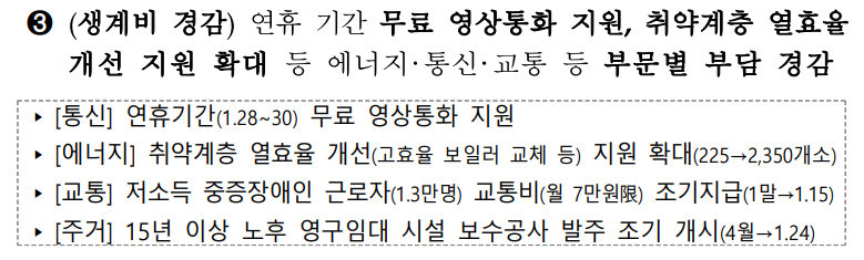 • 노인 및 취약계층 지원: 고효율 보일러 교체, 교통비 조기 지급.