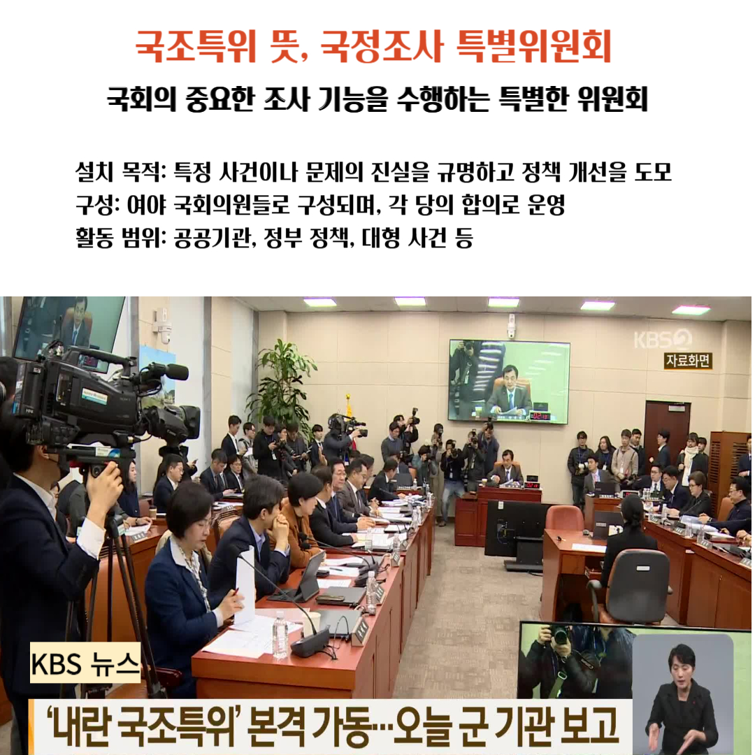 국조 특위는 국회가 특정 사안에 대해 깊이 있는 조사를 진행하기 위해 설치하는 임시 위원회입니다. 국정의 문제점이나 사건의 진상을 규명하고, 이를 통해 정부의 책임을 묻거나 개선책을 제시하는 데 목적이 있습니다.