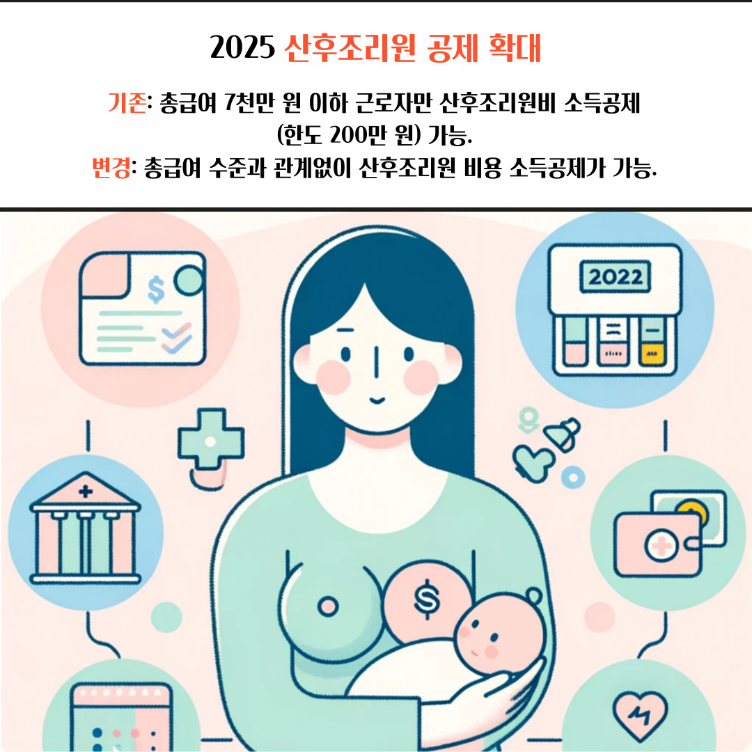 - 기존: 총급여 7천만 원 이하 근로자만 산후조리원비 소득공제(한도 200만 원) 가능.