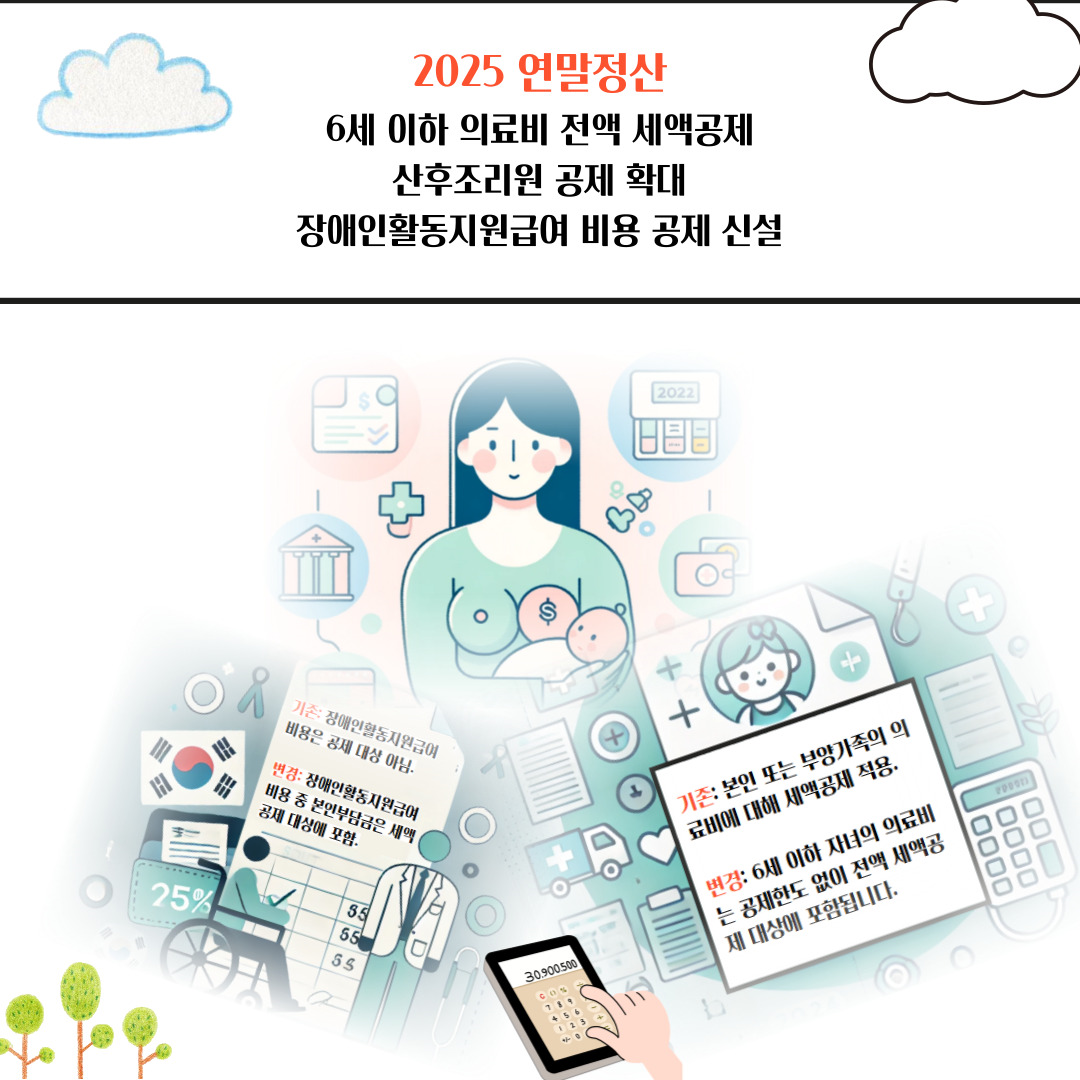 2025 의료비 세액공제: 6세 이하 의료비 전액 공제, 산후조리원 공제 확대, 장애인활동지원급여 비용 공제 신설